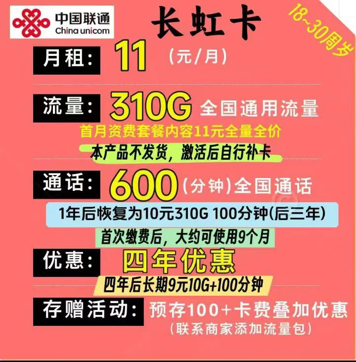 ✅首年月租 11 元 310G+600 分钟通话,2-4 年每月10元310G+100分钟