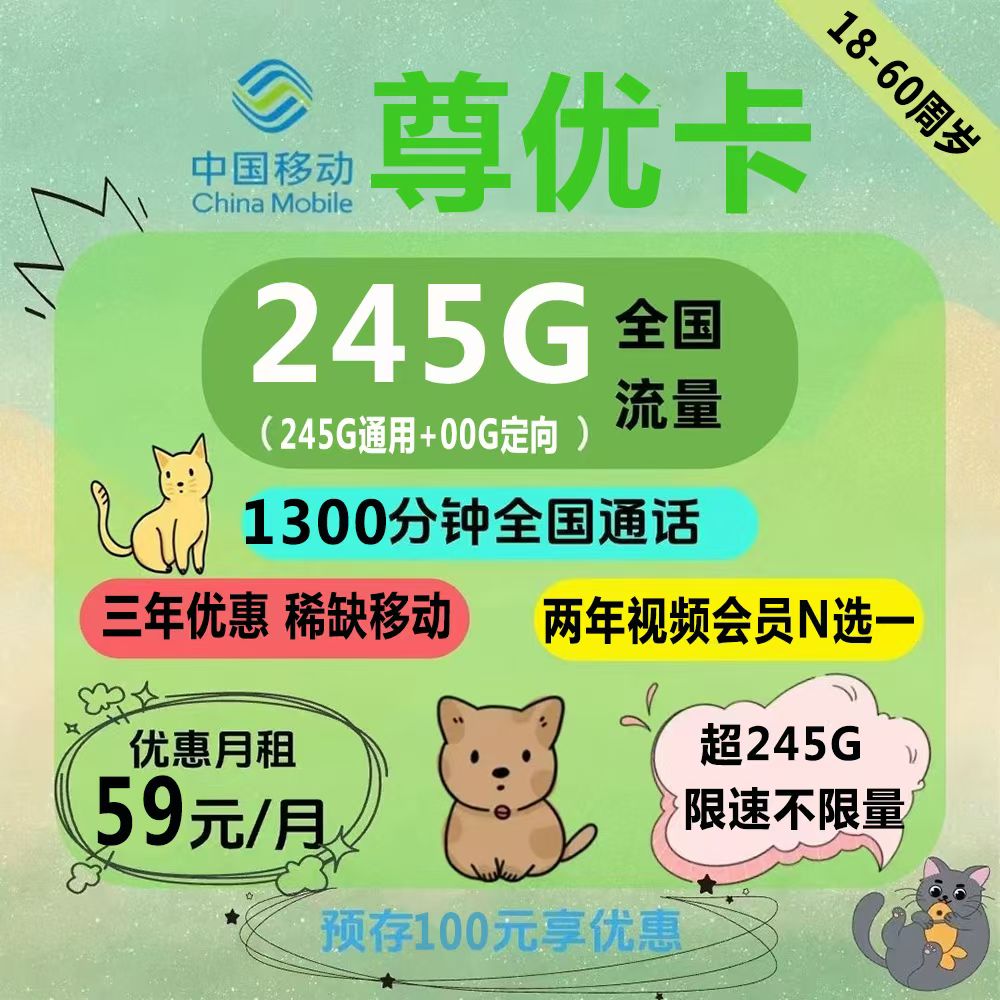 新品移动59元245G全国流量➕1300分钟通话